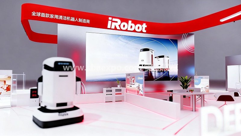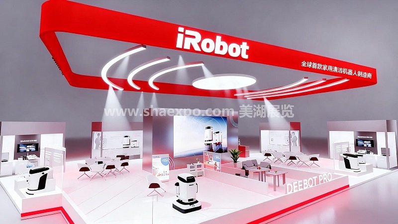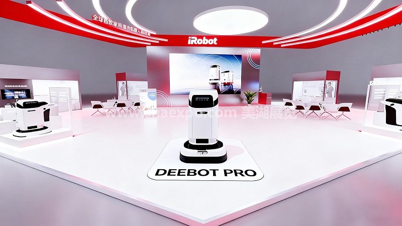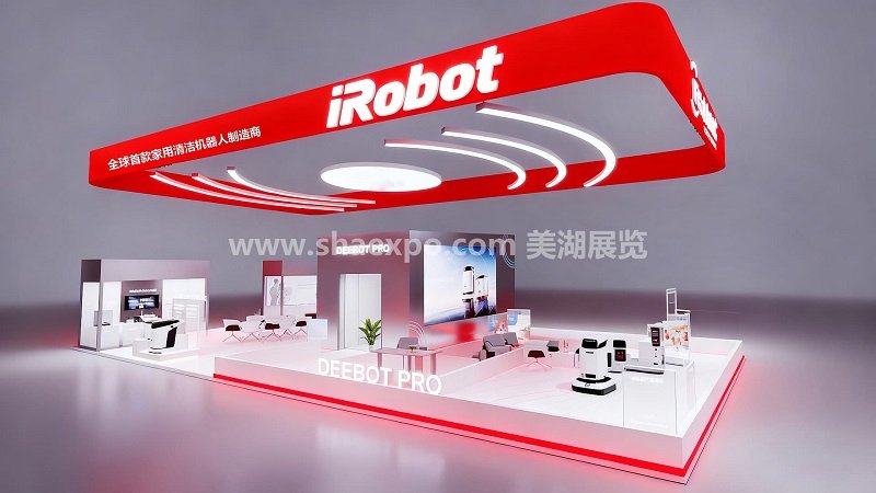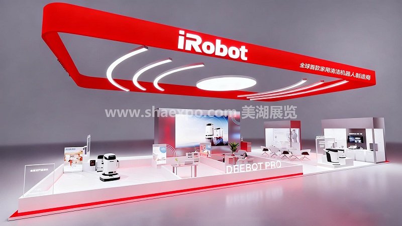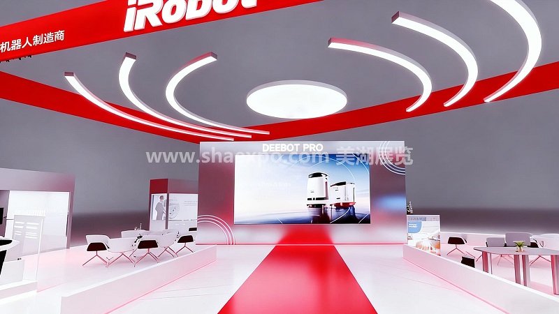 展台最醒目的设计是顶部的红色悬浮式灯箱结构,大面积红色与白色 “iRobot” 品牌标识形成强烈视觉冲击,搭配 “全球首款家用清洁机器人制造商” 的品牌定位语,在远距离就能完成品牌信息传递。灯箱底部嵌入的环形灯带与弧线造型,既呼应了机器人导航的科技属性,也为空间增添了动感与层次。